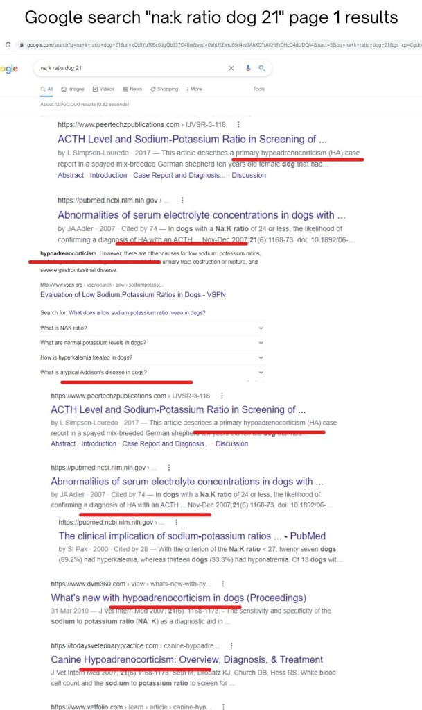 If I had seen Poppy’s blood test results “Na:K ratio dog 21” – that Magnolia House Veterinary Clinic deemed unremarkable and Googled them – page 1 of the results mentions Addison’s Disease or hypoadrenocorticism HA NINE times.